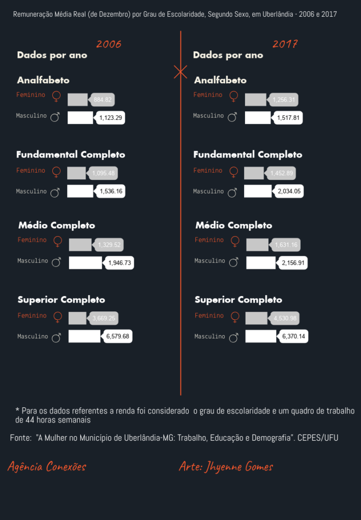 O Centro de Pesquisas Econômico Sociais (CEPES), da Universidade Federal de Uberlândia (UFU) lançou uma pesquisa em comemoração ao Dia Internacional da Mulher, comemorado em 8 de Março. Intitulada “A Mulher no Município de Uberlândia-MG: Trabalho, Educação e Demografia”, o volume 1 traz importantes números que possibilitam entender um panorama sobre a inserção da mulher no mercado de trabalho em Uberlândia. Considerando dados entre 2000 e 2017, foi possível observar que houve um crescimento dos postos de trabalho ocupados por mulheres mas, que, dentre esses quase vinte anos, as mulheres ainda ocupam profissões consideradas “femininas”, que se relacionam com o cuidado, como enfermeiras, professoras e faxineiras, além das atividades ligadas a vendas, como telemarketing e vendas no varejo. Neste 1º de maio, dia Internacional dos Trabalhadores, a Agência Conexões traz alguns números que se destacam quanto à remuneração média, segundo o gênero, nos anos de 2006 e 2017.